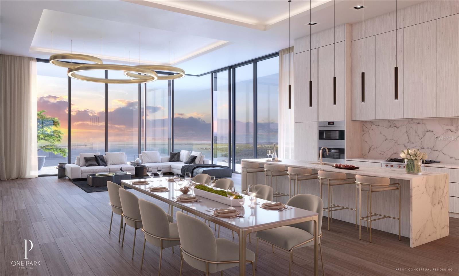 The 18-story One Park is bringing a quintessential lifestyle to one of Downtown Sarasota’s most sought after locations, Boulevard of the Arts. Featuring panoramic direct views from Bay Park to Downtown Sarasota and beyond, One Park offers an unrivalled Sarasota Bay lifestyle. Residence features include 10′ to 12′ floor-to-ceiling windows, smart home technology for seamless personalization with the touch of a button, a contemporary lighting package, fully built-out closets, marble, wood or porcelain slab flooring throughout, 8′ tall interior doors, midnight bar in primary bedrooms, Subzero and Wolf appliance package, and expansive outdoor terraces with modern glass railings and summer kitchens. World-class amenities and services include resort-style infinity-edge pool and spa deck with lounge area, wellness spa, fully staffed One Park Executive Office Suites designed to serve as a flexible office space for residents, private theater room, and a state-of-the-art fitness studio featuring the latest high-tech exercise equipment, pilates, yoga and cycling rooms.